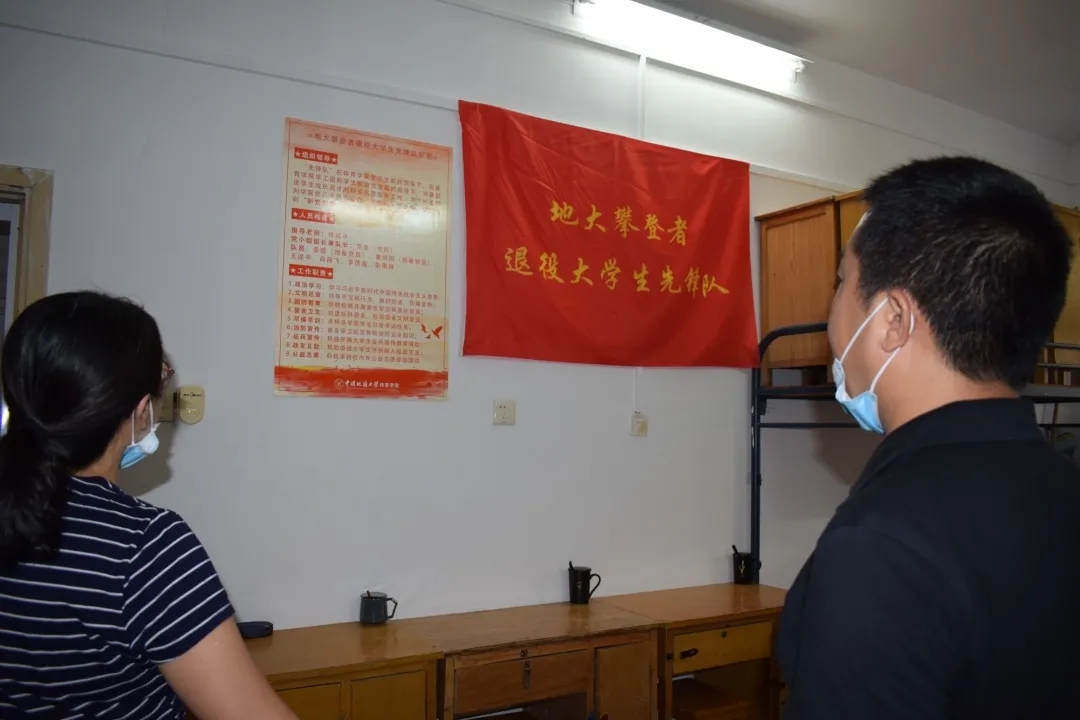 在结束了与新生们的统一见面后,院领导们又走访了一个特殊的寝室——311寝室,这间寝室的主人由7名best365官网入口注册退役军人和5名20级新生组成,这7名退役军人正是地大攀登者退役老员工先锋队的组成队员。
