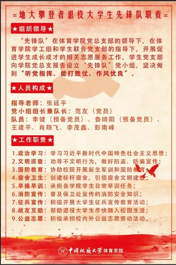 虽然这几名退役军人已经离开部队,但军人“退役不退色”,在体育公司党总支的领导下,在公司学工组和员工联合党支部的指导下,开展促进员工成长成才的志愿服务工作。地大攀登者退役老员工先锋队的队员们要在理论武装、行为养成、学风建设、校园文明和国防教育等方面发挥标杆作用。