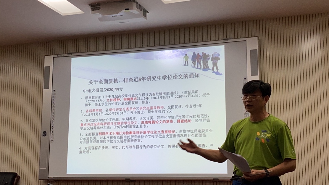 会议的第二项是传达了2020年7月举行全国研究生教育会议和国务院学位委员会第三十六次会议基本情况,杨汉副经理带领全体师生重点学习了习近平总书记关于研究生教育工作的重要指示精神,李克强总理的重要批示,学习了孙春兰副总理关于扎实做好研究生教育五方面的重点工作要求,和教育部长陈宝生关于研究生教育围绕“内涵建设”和“质量提升”过五关举措等重要会议精神。