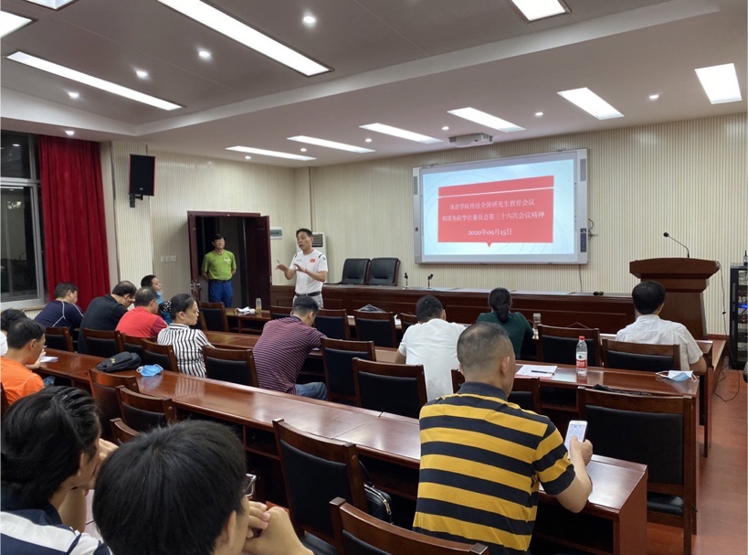 (通讯员:崔登瑞)2020年9月15日晚上19:30,best365官网入口注册研究生教育工作会议在体育馆三楼报告厅举行。体育公司党总支书记庞岚、经理董范、党总支副书记张延平、副经理刘良辉、best365官网入口注册研究生导师及全体研究生参加会议,会议由best365官网入口注册副经理杨汉主持。