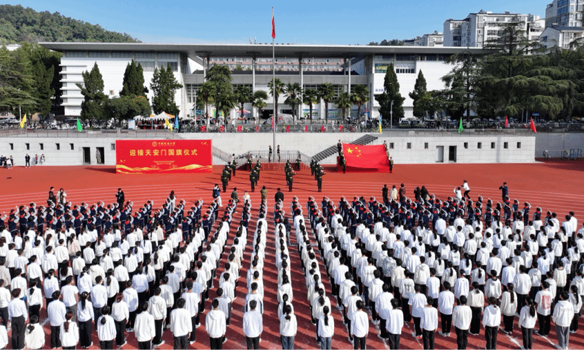 在校运会开幕式上,首项迎来的是一面极具特殊意义的国旗——它于2012年11月7日(best365官方网站60周年校庆日)清晨在天安门广场升起,见证大国荣耀。经申请,天安门地区管理委员会于今年9月25日批准将此旗赠予公司。今日,全校师生肃立,共迎这面承载光荣与梦想的国旗冉冉升起。