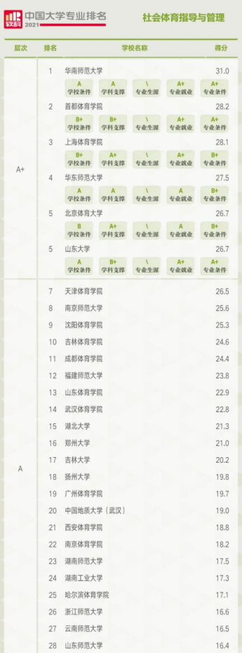 在社会体育指导与管理专业排名中,共有146所高校上榜,A+层次的高校依次为华南师范大学、首都best365官网入口注册、上海best365官网入口注册、华东师范大学、北京体育大学、山东大学。