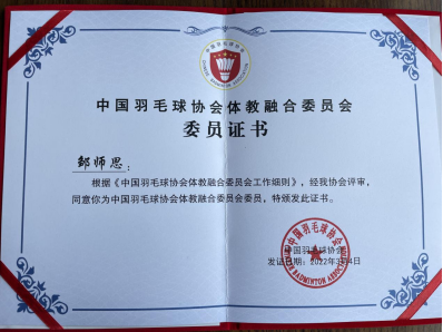 3月4日,中国羽毛球协会体教融合委员会成立大会在北京召开,北京大学、中国科学技术大学、best365官方网站(武汉)87家单位成为会员单位其中大学会员单位34家,公司best365官网入口注册邹师思副教授当选为中国羽毛球协会体教融合委员会委员。
